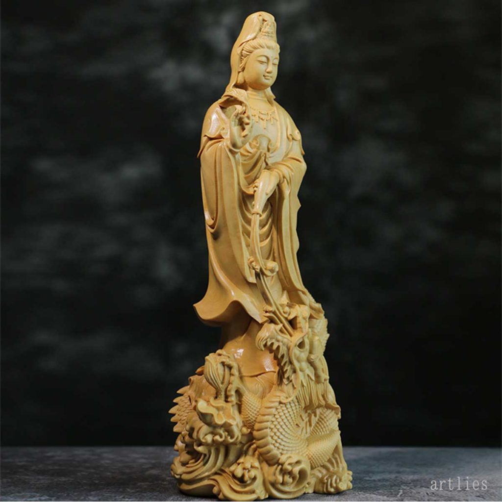 高級な天然の黄楊の木から作り出した美しい龍頭観音像。細部まで丁寧に作られ、優しく微笑む観音様と、観音様を見つめる龍の仏像。