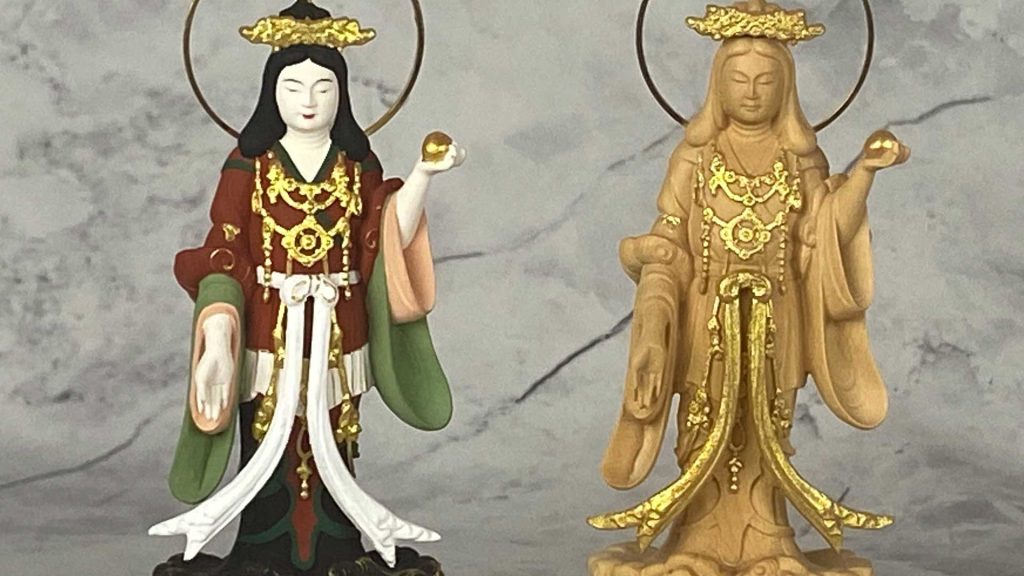吉祥天とは、インド神話のラクシュミー女神が由来で、富と繁栄、そして美の象徴です。仏教では、吉祥天は幸運と繁栄、そして家庭の平和をもたらす女神として信仰されています。吉祥天は、かつて七福神の一員としても数えられていました。彼女の姿は立派で美しい天衣を身にまとい、左手には願いを叶える力を持つ『如意宝珠』を掲げ、右手では人々の不安を取り除く『施無畏印』を示しています。
