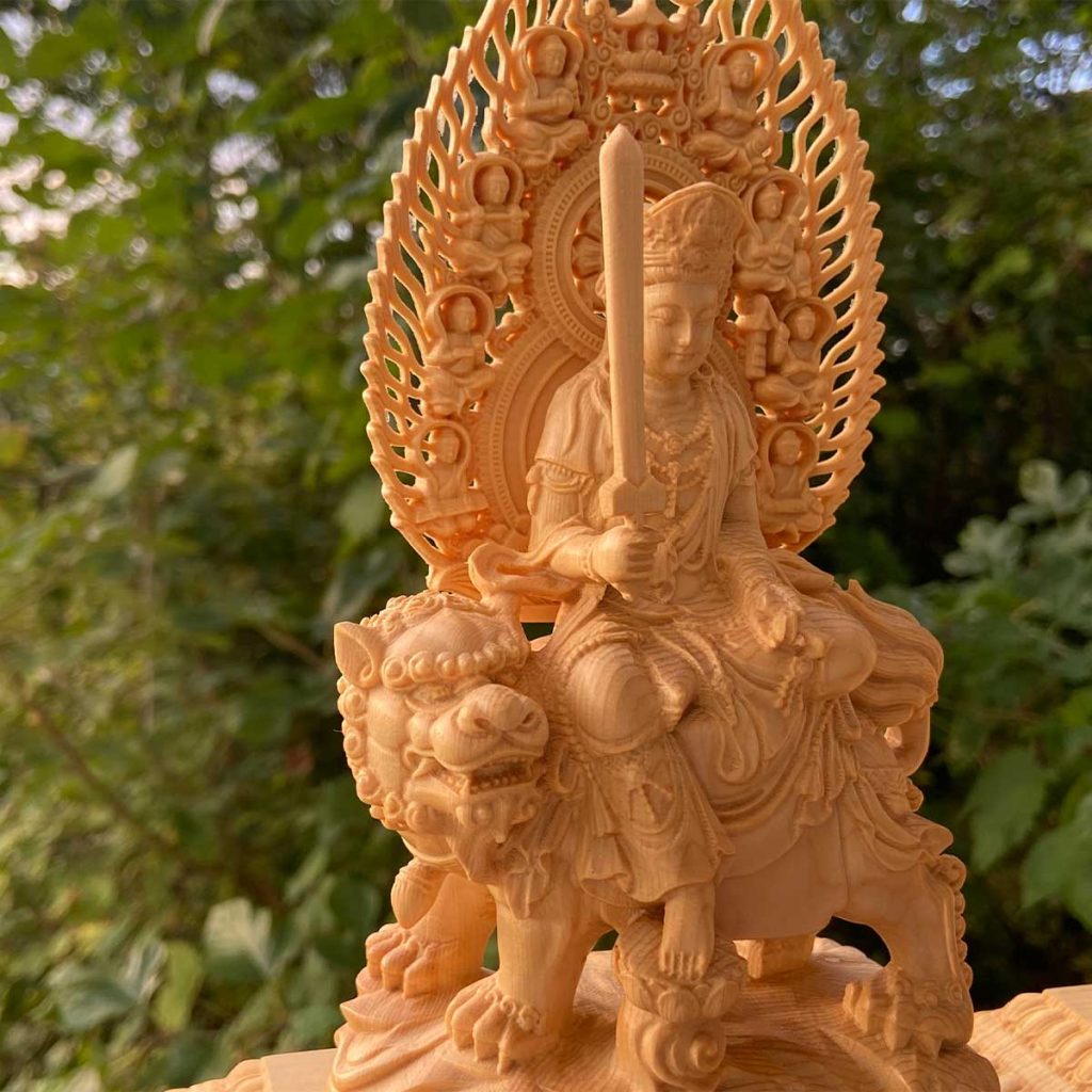 さらに、文殊菩薩は「獅子に乗る菩薩」として知られ、勇敢な姿で描かれています。この獅子は、恐れを克服し、真実に基づいた行動を取る勇気を象徴しています。つまり、文殊菩薩は私たちに、恐れに打ち勝ち、知恵を活かして前進する力を授けてくれるのです。