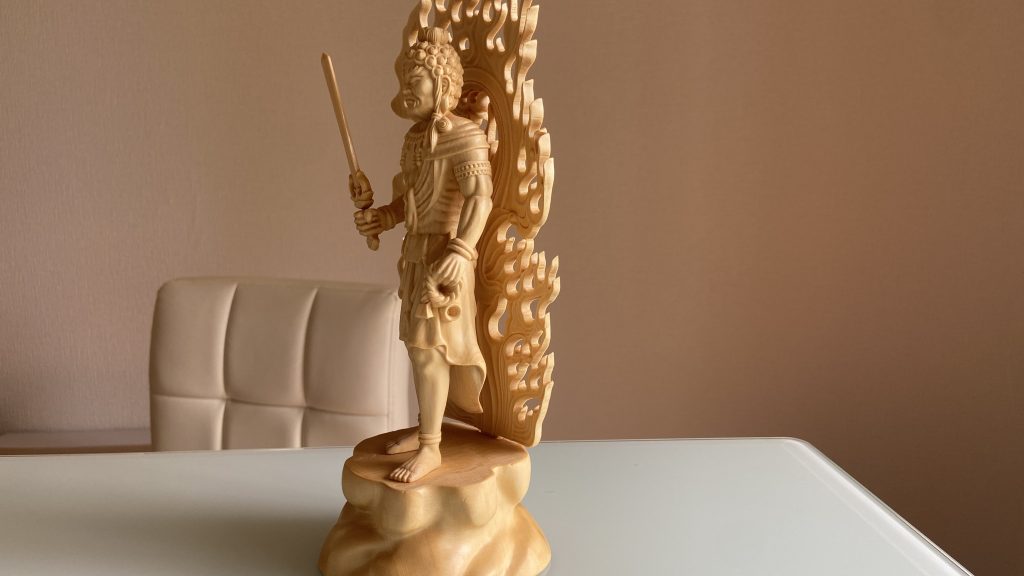 こちらの不動明王の仏像は、全長27.5cmの迫力あるサイズで、室内のどこに置いても存在感を発揮します。また、使用されているのは天然の桧木で、自然の香りが心を落ち着かせ、場のエネルギーを清める効果もあります。この火炎光背と桧木の香りの組み合わせが、不動明王のご利益を一層感じさせてくれます。