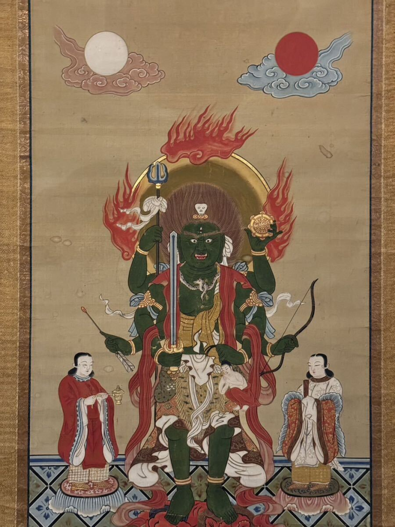 青面金剛の姿は、畏怖を与える厳しい表情と独特のシンボルで知られています。この姿は邪悪な存在に対して威圧を与えるためのものであり、信仰者を守るための力強い表現です。
