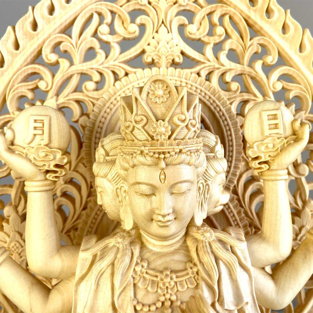 多くの仏像では、摩利支天は6本の腕と3つの顔を持つ男性像として表現されています。これは、全方位から人々を守り、困難に多面的に対応する力を象徴しています。それぞれの手には剣や弓矢、盾などの武器が握られていますが、これらは戦いや守護の神としての役割を強調する象徴的な要素です。一方で、天女としての姿も表現されることがあり、その美しさは平和や調和を象徴するとされています。