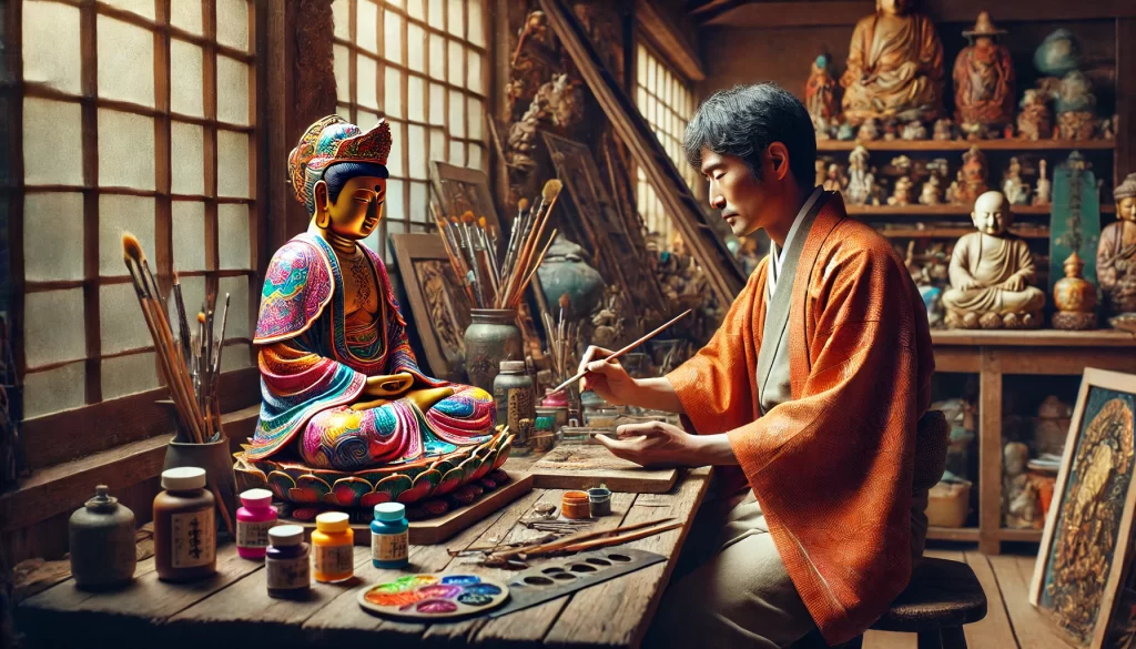極彩色仕上げの仏像は湿気や直射日光を避けて保管し、柔らかい布で定期的に埃を払うことで美しさを長持ちさせます。