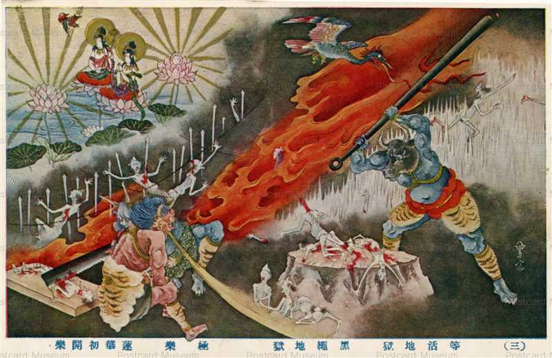 - 特徴:焦熱地獄以上の激烈な熱。熱した鉄棒を喉に突っ込まれ、身体が爆ぜる。