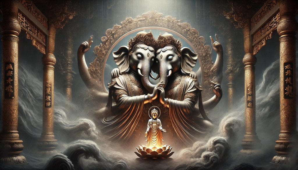 歓喜天は、象の頭を持つ男女神が抱き合う姿で表される特異な仏です。その姿には、陰陽の調和、対立の融合、絶対的なバランスといった仏教的な意味が込められており、多くの寺院では「秘仏」として非公開とされています。
